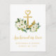 Nautical theme coastal wedding save the date postcard with a cute and romantic gold anchor with a heart at the top nestled in a white boho bouquet, perfect for a cruise, beach, or summer yacht club wedding.