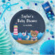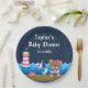 This cute and fun plate features a nautical sailor girl bear on a wooden deck with a seagull and a crab. In the background there is a pink and white lighthouse, a cute bird on a sailboat, ocean waves and a navy blue starry night sky. The text combines bold and serif fonts for a stylish and modern look. This is perfect for a nautical themed baby shower.