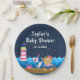 This cute and fun plate features a nautical sailor girl monkey on a wooden deck with a seagull and a crab. In the background there is a pink and white lighthouse, a cute bird on a sailboat, ocean waves and a navy blue starry night sky. The text combines bold and serif fonts for a stylish and modern look. This is perfect for a nautical themed baby shower.