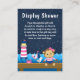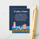 This cute and fun display shower enclosure card features a nautical sailor girl monkey on a wooden deck with a seagull and a crab. In the background there is a pink and white lighthouse, a cute bird on a sailboat, ocean waves and a navy blue starry night sky. The text combines bold and serif fonts for a stylish and modern look. This is perfect for a nautical themed baby shower.