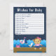 This cute and fun wishes for baby card features a nautical sailor girl monkey on a wooden deck with a seagull and a crab. In the background there is a cute pink bird on a sailboat, ocean waves and a navy blue starry night sky. The text combines bold and serif fonts for a stylish and modern look. This is perfect for a nautical themed baby shower.