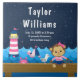 This cute and fun tile features a nautical sailor girl monkey on a wooden deck with a seagull and a crab. In the background there is a pink and white lighthouse, a cute bird on a sailboat, ocean waves and a navy blue starry night sky. The text combines bold and serif fonts for a stylish and modern look. It can be personalized with your baby's birth stats, such as name, size, date and time of birth, or if you would like to give it as a shower gift you are able to edit and remove text.