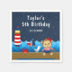 This cute and fun napkin features a nautical sailor girl monkey on a wooden deck with a seagull and a crab. In the background there is a red and white lighthouse, a cute bird on a sailboat, ocean waves and a navy blue starry night sky. The text combines bold and serif fonts for a stylish and modern look. This is perfect for a nautical themed birthday party.