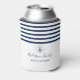 This can cooler is the perfect addition to your lake or beach house. The nautical design offers navy blue and white stripes a rope border circle accented with a boat anchor and modern handwritten style text for you family name.