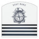 This image features a boat name, wheel and anchor on a navy blue and white striped background.