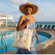 A tote with a Christmas Stocking filled with all beach elements. Perfect to serve as a durable and fun gift bag on a Christmas holiday away or any day.