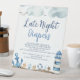 Nautical Late Night Diapers Baby Shower Sign featuring a nautical theme with sea, sea shells, boats, and lighthouse artwork
