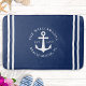 This unique nautical bath mat in light navy blue and white features templates for the family name, year and place and is decorated with an anchor and wavy stripes. It's a stylish bathroom decor idea for a beach and lake house, yacht, or boat.