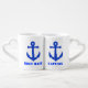 Stylish white ceramic interlocking mug set, with graphics decorative blue anchors, on the front and back of each mug. Blue text reads Captain, on one mug and First Mate, on the other mug. Great gift idea.