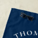 Rich navy blue and white create a bold, striking look on this personalized family beach house towel. A white anchor showcases an arched family monogram name with established year, Beach House featured text, and customizable location in script below. All text is fully editable to add your family details. A handsome coastal accessory for the vacation home and a popular personalized gift for families who love the shore.