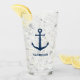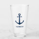 A classic nautical beer glass featuring a navy blue anchor with a custom name monogram beneath in bold serif type. The clean navy anchor design on clear glass brings timeless maritime charm to any home bar or boat galley. A handsome personalized gift for groomsmen at nautical weddings, boat owners, or coastal decor enthusiasts. All text is fully customizable.