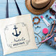 Set sail for the big day with this nautical bridesmaid tote featuring a navy anchor framed by a decorative knotted rope border. A personalized name in elegant script and "Bridesmaid" in bold lettering complete the monogram design. Perfect for a destination beach wedding or coastal celebration. Name and role text are fully customizable.