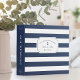 Organize your plans for the big day in this nautical chic personalized wedding planning binder. Beautiful navy blue and white design features a wide horizontal striped background with your names and wedding date set on a notched badge element, with a small navy blue anchor at the center. Personalize the spine as well using the simple template fields provided.