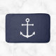 Modern Minimalist Nautical Bath Mat featuring white anchor on navy blue background.
