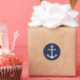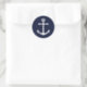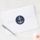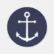 Modern Minimalist Nautical Round Sticker feature white anchor on navy blue background.
