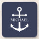 This personalized gift features a white anchor design with custom name in a classic white serif font on navy blue background.