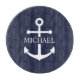 This personalized gift features a white anchor design with custom name in a classic white serif font on navy blue background.