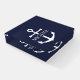 This personalized gift features a white anchor design with custom name in a classic white serif font on navy blue background.
