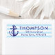 A nautical themed navy blue name and return address label with an anchor and rope next to your family name and address details on a pale blue striped background.