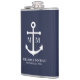 Designed with a white anchor illustration, it features personalized bride and groom monogram, name, and wedding date in a white serif font on navy blue background.