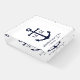 Designed with a navy blue anchor illustration, it features personalized bride and groom monogram, name, and wedding date in a navy blue serif font.
