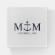 Designed with a navy blue anchor illustration, it features personalized bride and groom monogram and wedding date in a navy blue serif font.