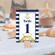 These table cards match the classic nautical wedding invitations. The simple, timeless design features navy blue stripes and a gold anchor flanked by the monograms of the bride and groom. The table number is in bold navy blue, and at the bottom is a gold ship’s wheel to steer your guests in the right direction.