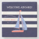 Personalized nautical stone coasters with navy blue and white striped pattern, sailboat, family name and "Welcome Aboard!" text. Easy to customize and personalize template coasters.