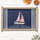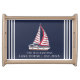 Create a personalized with your family name serving tray for a lake house with a unique nautical design that features a sailboat illustration with red sails, a "Lake House" saying, and the year established. The text on this design is customizable via the template.