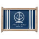 Custom wedding newlyweds serving tray features a navy blue nautical theme with boat anchor framed by a round rope with tied knot, custom monogram text that can be personalized with the bride and groom names and wedding date, and accented by vertical white stripes.