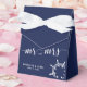 Nautical navy blue and white wedding favor boxes (tent favor box with white ribbon) with white wheel and changeable text - you can add bride's and groom's name and wedding date.