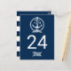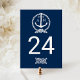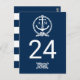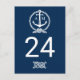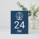 Nautical theme navy blue and white table number card features a monogram of the bride and groom's names and wedding date, boat anchor and rope details, and a horizontal stripe pattern on the back.