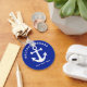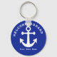 Nautical "Welcome Aboard" keychain design features a simple, stylish navy blue and white coastal style design with boat anchor accent. Personalize the custom text with the name of your boat.