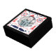 This product is made with beautiful mahogany wood, the inside is lined with white satin. The hinges are very sturdy and keeps a tight close on the box. The pattern tile is wonderful It's truly is an exquisite product. This is a gift for anyone and for any occasion. A fine wooden piece to display on your furniture anywhere in your home. The printing accented the design on the box very well. Very pleased with the Font.