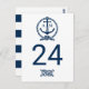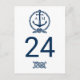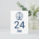 Nautical theme navy blue and white table number card features a monogram of the bride and groom's names and wedding date, boat anchor and rope details, and a horizontal stripe pattern on the back.