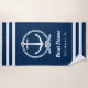 A bold navy blue nautical beach towel featuring an elegant anchor encircled by a rope wreath with a personalized script boat name and customizable location below. Crisp white stripe accents at the top and bottom complete the classic coastal look. All text is fully editable to feature your boat name and home port, marina, or lake. A top-selling gift for boat owners, captains, and anyone who loves nautical style on the water.