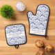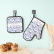 Whimsical, watercolor oven mitt and pot holder set with a nautical navy and white pattern of scallop sea shells and text that can be personalized. Perfect for a beach house, boat or coastal decor.