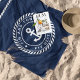 Up your boat game with these personalized beach towels in classic nautical navy blue and white. Personalize with your boat name and ship's registry (or captain's name) in white lettering, curved inside a rope badge with an anchor illustration in the center and rope stripe detailing across the top.