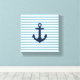 8" x 8" Nautical nursery themed wrapped canvas for the nursery. Dark blue anchor printed on light blue and white striped background.