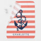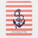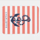 Design features a rope and anchor illustration in classic navy blue, on a background of coral and white stripes. Personalize with a name or text of your choice. Coordinating accessories available in our shop!