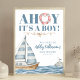 Welcome guests to your nautical-themed baby shower with this charming sign featuring a classic blue and white sailboat in the middle of a blue ocean, complete with a seagull perched on a rock. A red life-ring, blue water, and rope details add to the maritime charm.