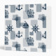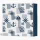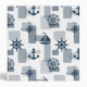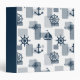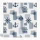 Seamless nautical themed design with sailing boat, compass, anchor and sailing wheel decoration on blue and white geometrical background
