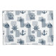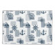 Seamless nautical themed design with sailing boat, compass, anchor and sailing wheel decoration on blue and white geometrical background