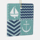 A quilt inspired pattern of stormy turquoise squares, decorated with a white sailboat and anchor, and deep navy blue squares, accented with paler blue chevrons and waves, is accented by white stitching to create a classic nautical feel.
