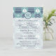 This invitation features a quilt inspired pattern of stormy turquoise squares, decorated with a white sailboat and anchor, and deep navy blue squares, accented with paler blue chevrons and waves, accented by white stitching to create a classic nautical feel. A scallop seashell holds a monogram set above a lighter section on the lower portion of the card where you can find sample text that you can customize to create a personalized invite for your event.
