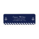 Nautical wedding return address labels with navy blue and white stripes, white anchor and custom white text, printed on navy blue background