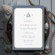 Simple beach wedding ideas: an elegant, modern classic wedding invitation with a nautical theme, featuring a simple rounded rectangle frame with a nautical rope effect over a dusty blue nautical burlap background (digital effect), as well as a simple illustration of a sail boat. It also features the monograms of the couple. You can personalize this DIY wedding invitation fully. A lovely choice for a boat wedding, a yacht wedding, an ocean wedding, a seaside wedding, a waterside wedding or a beach wedding, for a couple who loves the ocean, the sea, the beach, sailing etc.