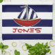 This cute and trendy kitchen towel has a sailboats on a background of navy and white horizontal stripes. It will be a great addition to your home, boat or beach house decor. Customize with a name or monogram initial.