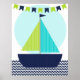 A nautical sailboat design nursery poster great for baby's room or an older child's room features a sailboat with green and teal sails, a lime green and navy blue flag banner, and chevron stripe water!