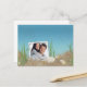 Customized photo frame in ocean bubbles with starfish and seashells in sand for save the date.